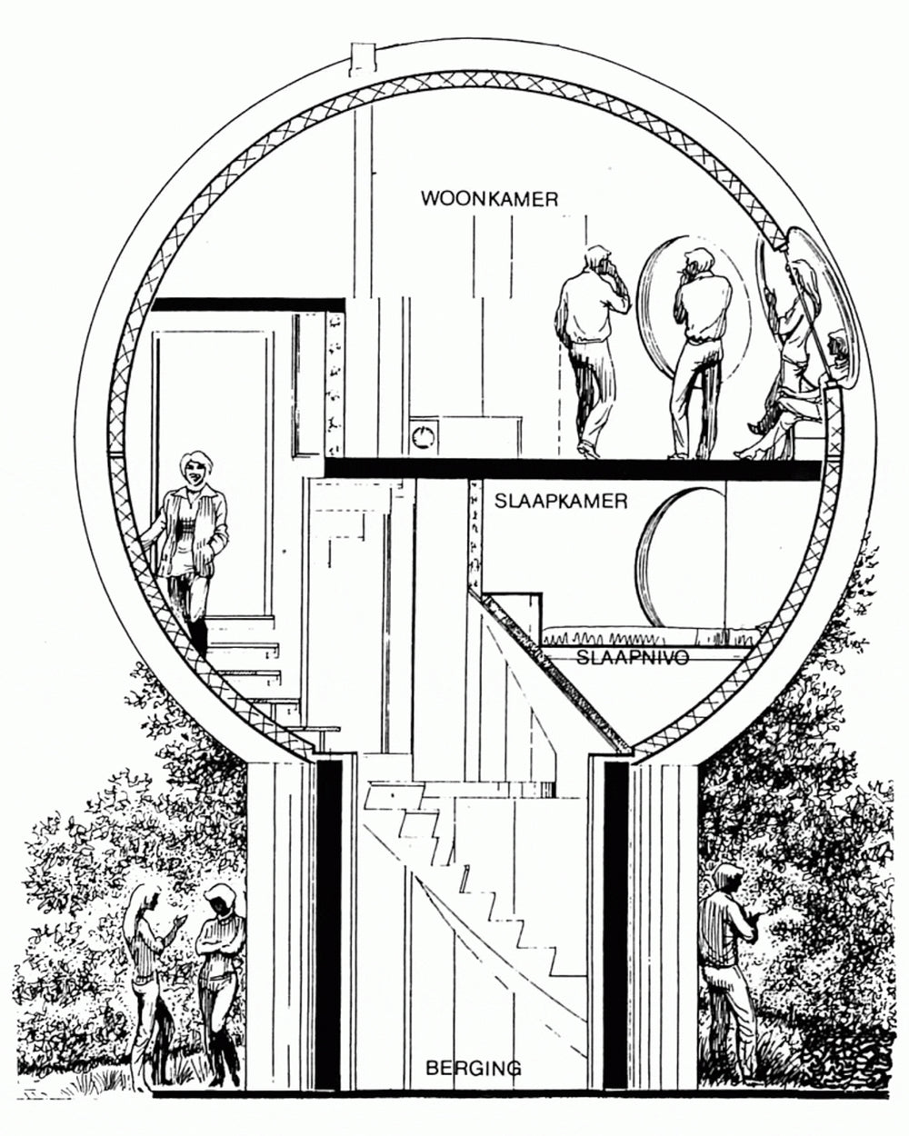 The Bolwoningen came to life shortly after Kreijkamp envisioned them with the help of a Dutch government subsidy which aimed to try to remedy the problems identified in the first wave of social housing, with a focus on a connecting citizens more with nature, all while maintaining affordable maintenance and energy use. The globular houses sit atop a small cylindrical concrete base, which provided an entryway as well as storage and utility spaces. The spheres themselves are constructed from oh-so-seventies fibreglass, which at the time was becoming a mature technology, being explored for use in everything from automotive bodies to furniture. Here it allowed for a low-maintenance, pre- fabricated and remarkably cheap to install solution to creating a housing structure.