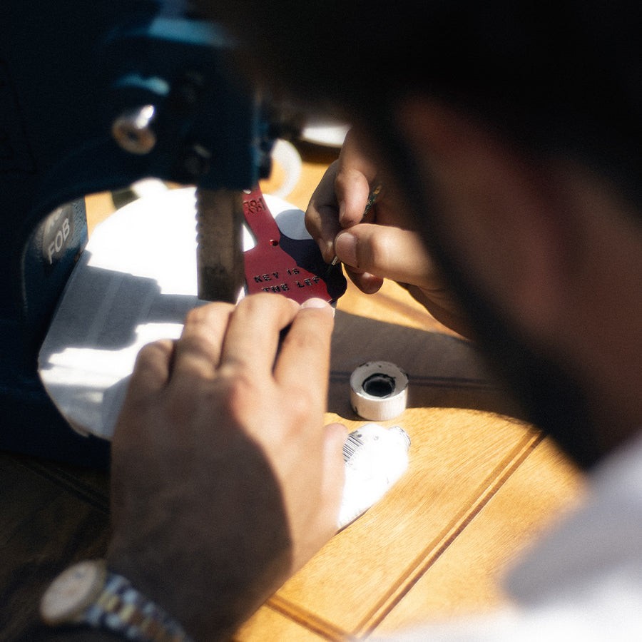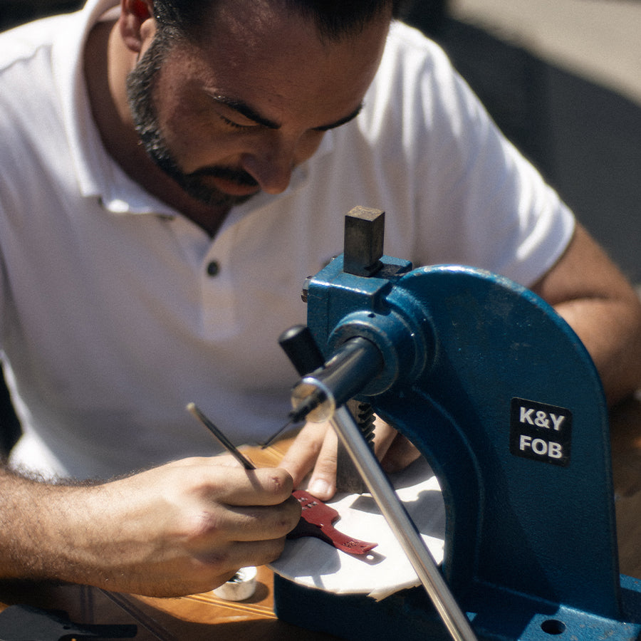 If ever you find yourself on a stroll through the town of Monza, you might be lucky enough to spot Davide Mariscotti of K&YFOB working his craft in the sunshine. He’ll be seen at a table with his leather press and paintbrushes, producing his “proudly made in Monza” key rings as he has done since 2018.