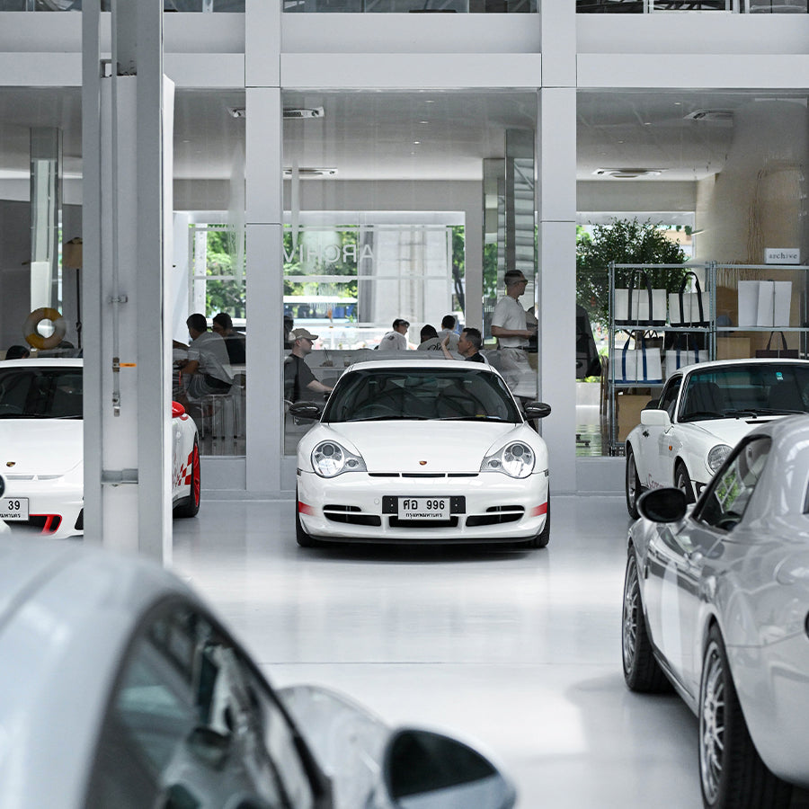 A Sunday morning in Bangkok, where three Porsches — united by livery, not lineage — gather in a space that was never meant to hold them.
