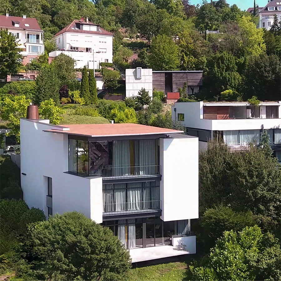 High up in the hills of Stuttgart and hidden in plush, lively greenery there are a few extraordinary houses looking down towards the city from their promontory. Among them is the Rudolph House by Alexander Brenner, a renowned name in Stuttgart’s architecture circles. Brenner’s team has been expanding their portfolio over the years, defining a recognisable style through a few key architectural points, such as wide expanses in both horizontal and vertical planes, minimal colours and shape, and lush natural settings.