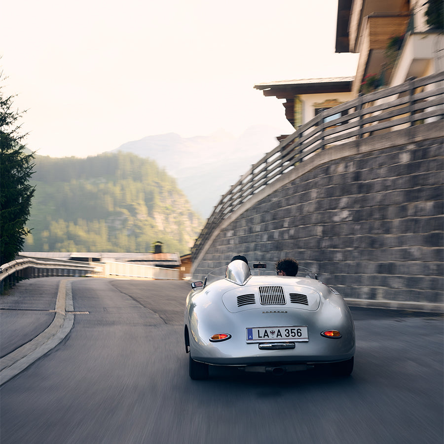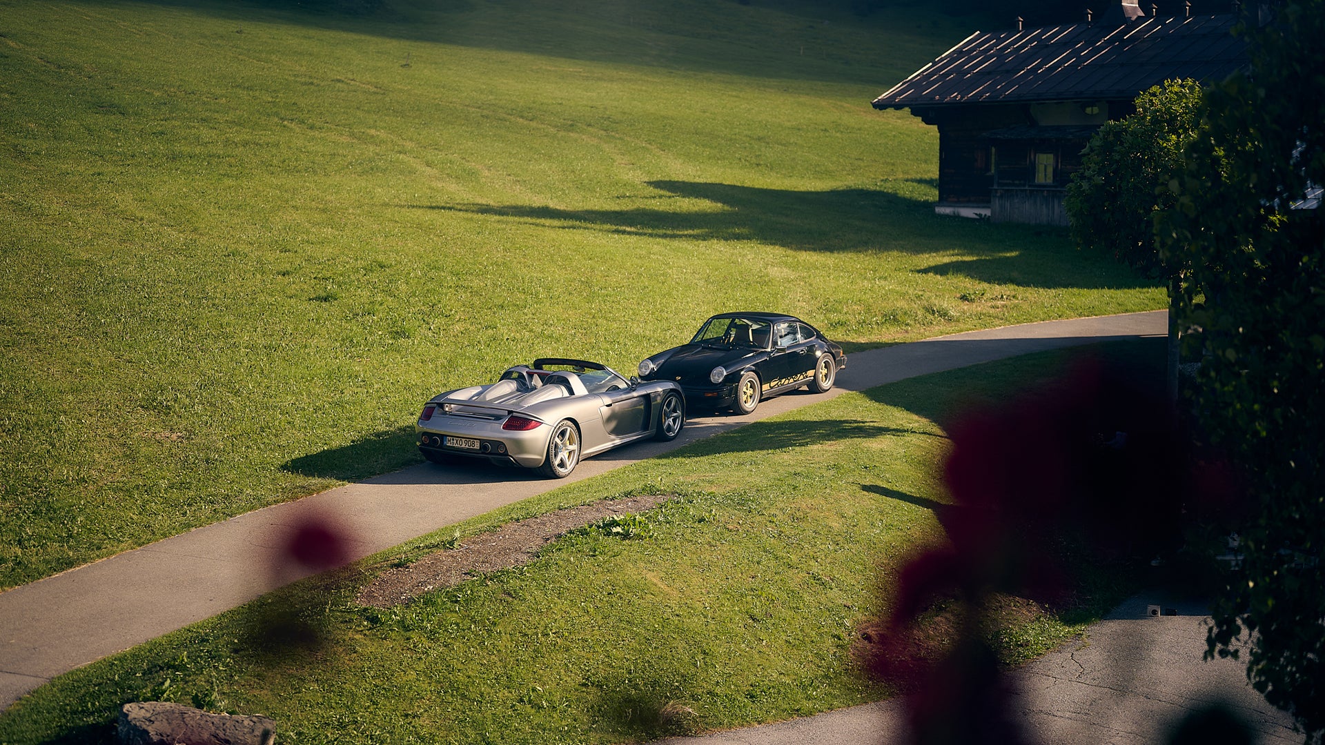 On the way back I trade seats. From the passenger seat the Carrera GT takes on a new dimension; the cabin feels like an amphitheatre, the spoiler rising behind us, the V10 spooling into fury. We enjoy the curves all the way back to the Lech Lodge, where Klaus’ freshly rallied 2.7 RS sits parked at the base of a nearby peak, awaiting a deep clean. Outlines of the stickers still mark the dusted paint, and regulation notes and map clippings fill the passenger seat. The morning sun catches both cars together, and we can’t resist photographing them nose to nose. Not a bad start to the day.
