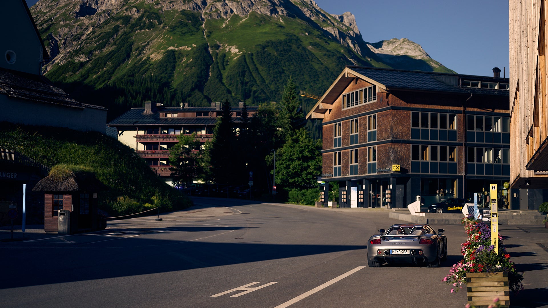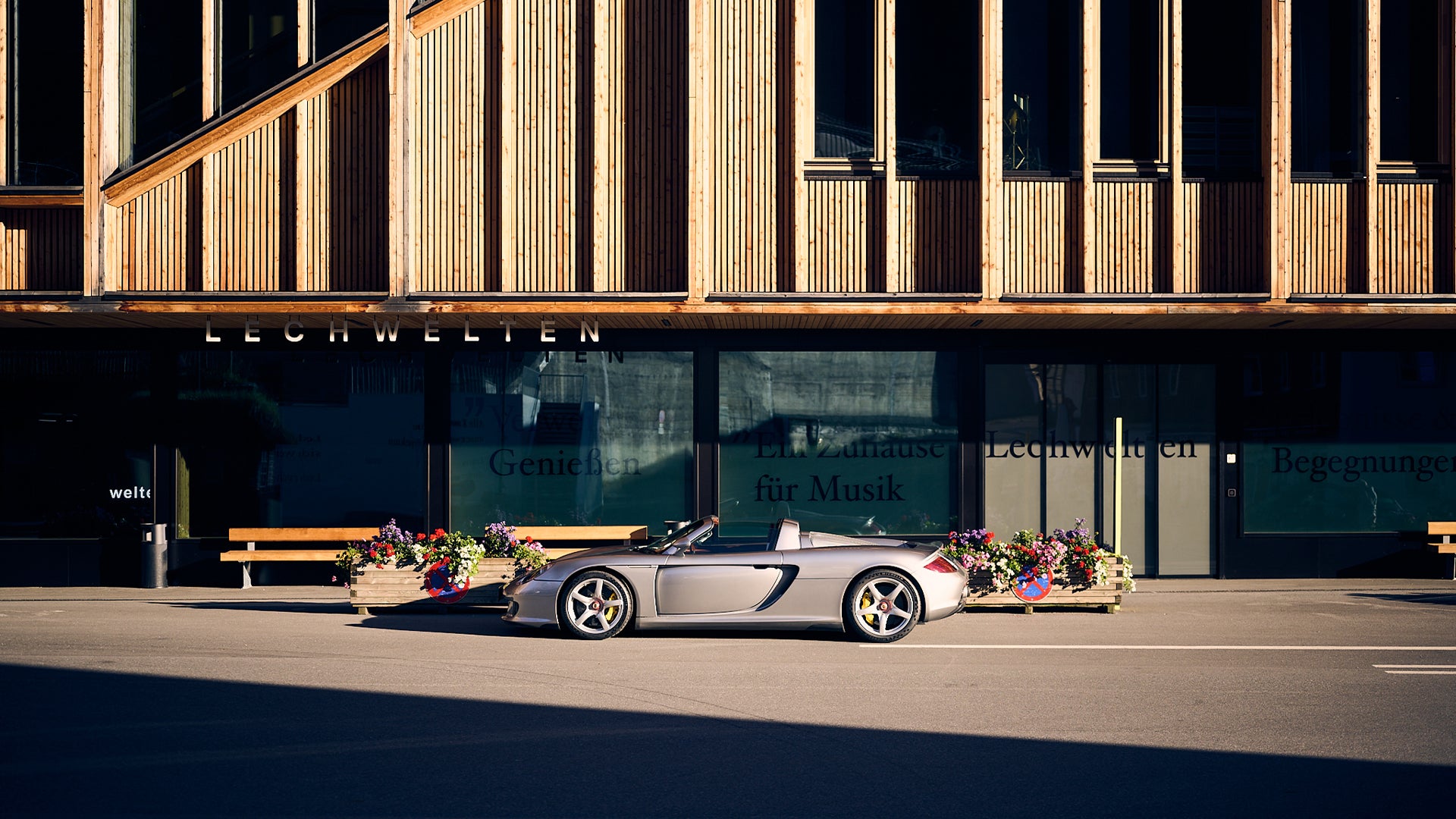 Though it feels like a special occasion it's simply one of Klaus’ many Dawn Drives, as we came to call them. We roll into a café five minutes behind just as the first light breaks through the valley and casts the town in a warm haze. Almost staged by accident, the Carrera GT sits in the bus stop outside the Lechwelten Congress Center. Its Polar Silver curves contrast sharply against the building’s glowing façade. We stare longer than we should over a coffee, realising that the times we appreciate these fast-moving objects the most are when we slow down.