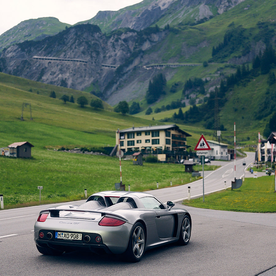 Klaus is behind the wheel, with Maxi, his sixteen-year-old son beside him - a smile stretched every bit as wide as his father’s as they take the first turn into the sun. We try to give chase in the rental. The Arlberg mountains fill our windscreen as the Carrera GT dances from line to line, the sound of its V10 bouncing back at us off the rock faces. Then, with the first straight, it’s gone. Vanished with the force and certainty of a jet tearing off a runway, unfiltered power just about bound by its precision engineering to obey direction.