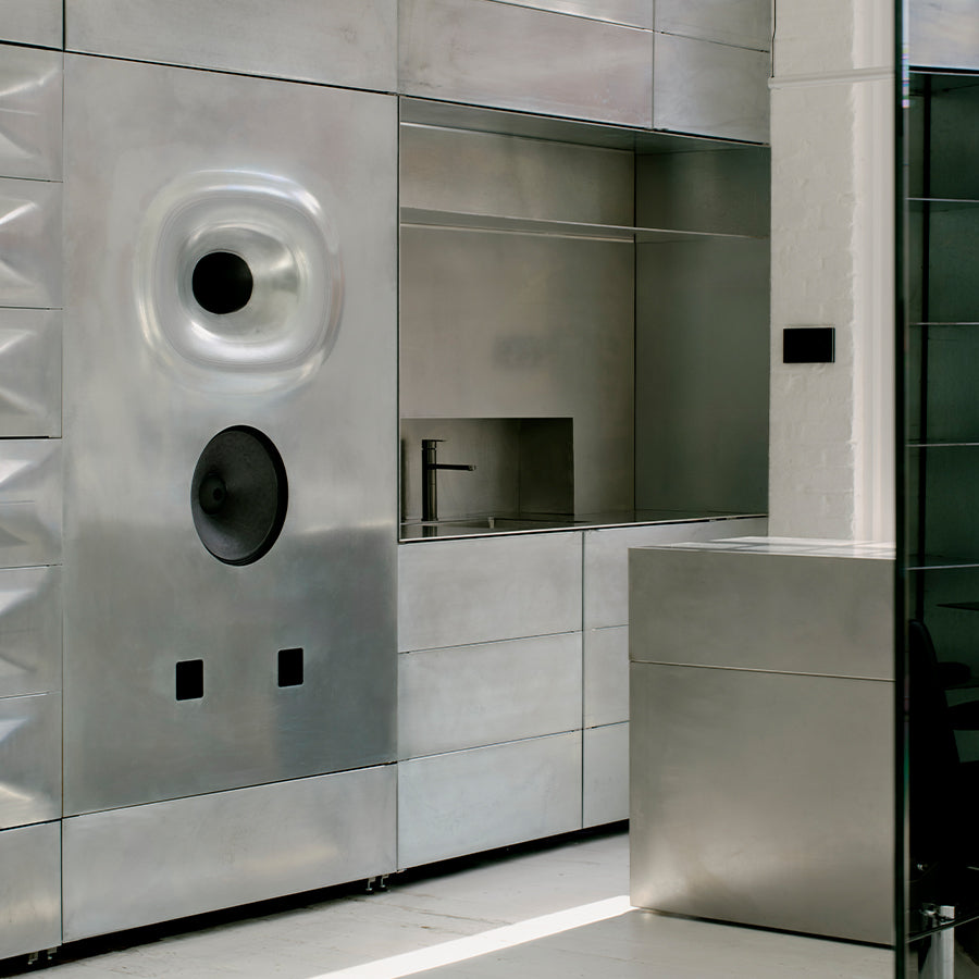 A salon tuned like a sound system; design studio Unknown Works has transformed Salt Salon London’s Victorian storehouse into an impossibly serene listening space across three floors, anchored by a pair of machined steel loudspeakers developed with the city’s audio maven Friendly Pressure. Constructed using “roboforming”, a low-energy additive manufacturing process that was developed specifically for this project, using salvaged metal and shelving from Blythe House, which previously stored artefacts from the V&A, British Museum, and the Science Museum.